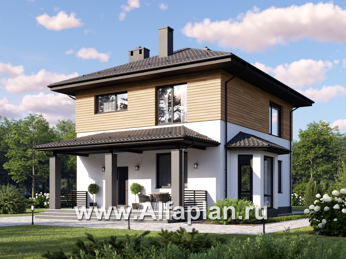 G117b-S Проект двухэтажного дома, с террасой и с эркером, планировка с кабинетом на 1 эт