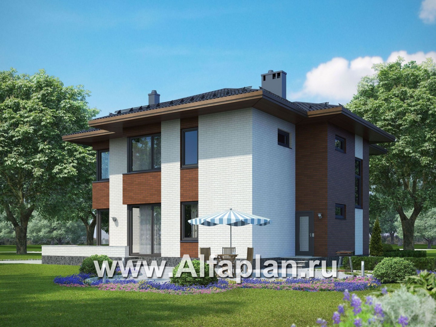 Проект двухэтажного дома, планировка с кабинетом и спальней на 1 эт, с террасой, в современном стиле - технические характеристики